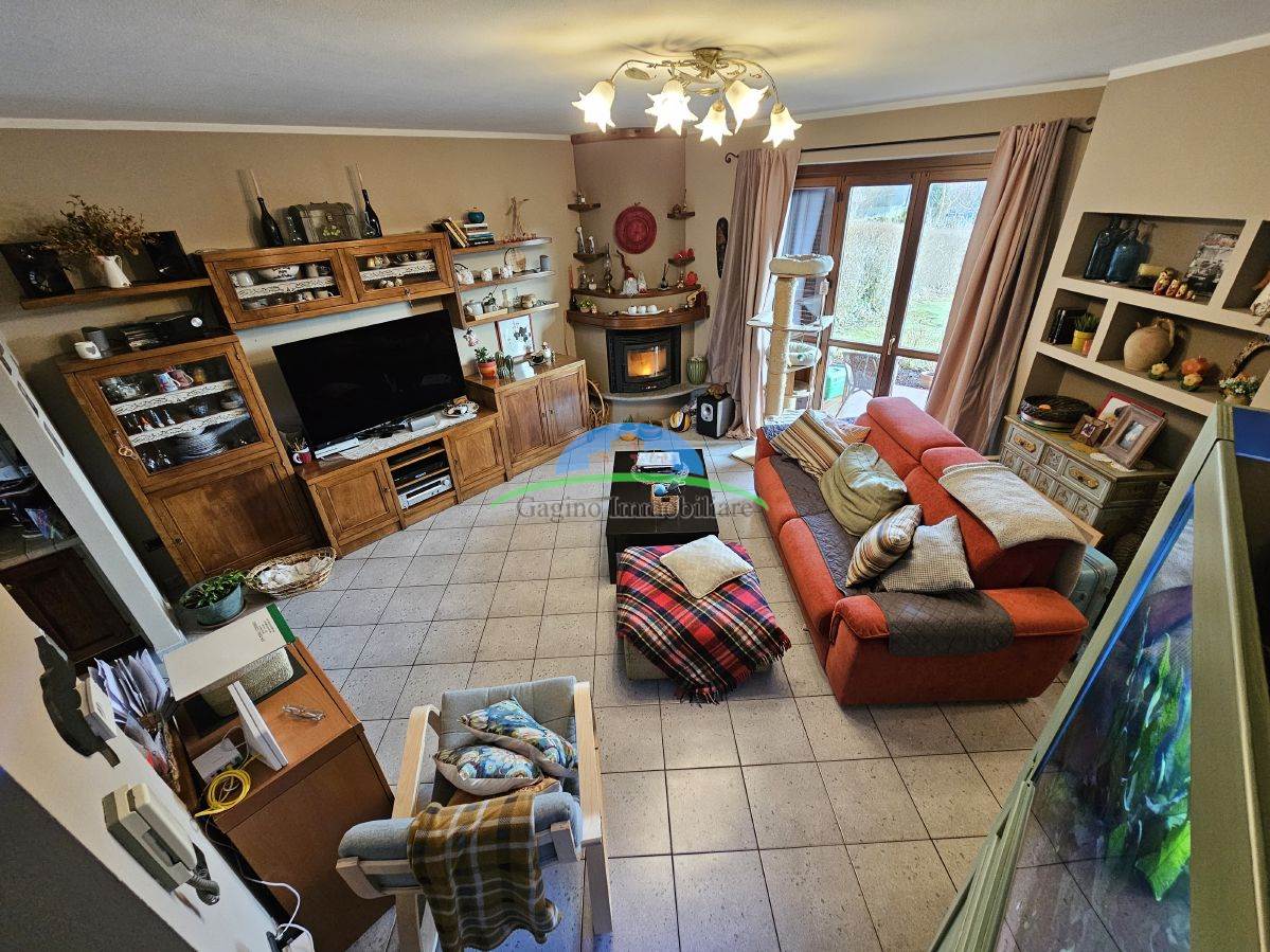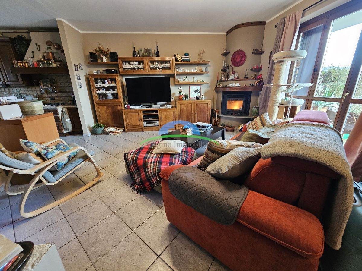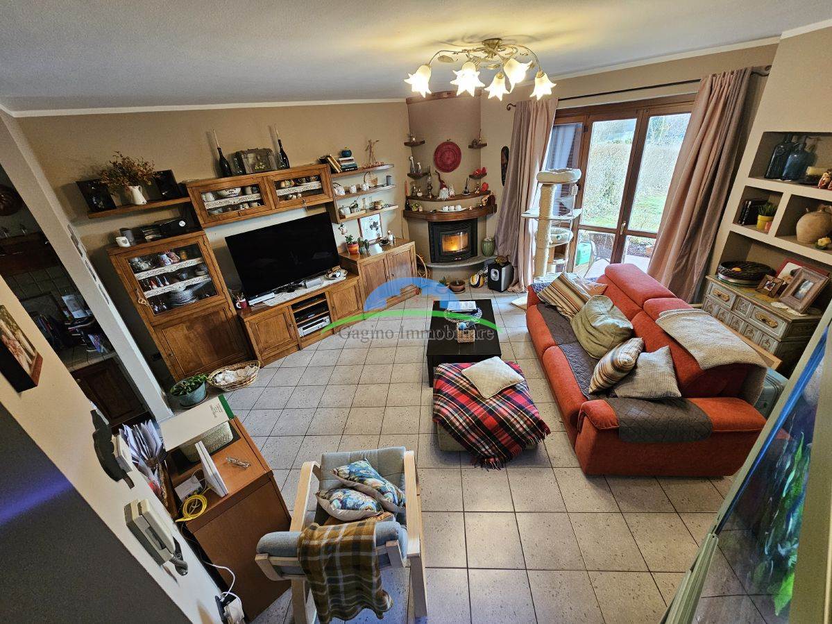 The entrance opens onto a large living room flooded with natural light, where a modern pellet fireplace creates a cozy atmosphere and ensures efficient heating on winter evenings. From the living room, a large window allows you to directly access the front garden, a private green corner ideal for relaxation.